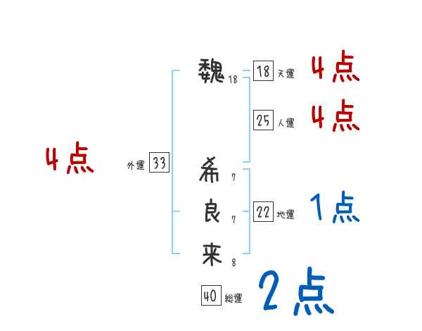 天運![]() | 魏希良来さんの天運は18画の4つ星!情熱的で剛気。忍耐力があり信頼される。 家系が持つ宿命的な運勢を表します。祖先から受け継いだ苗字ですので自分の力が及びません。家柄を象徴します。 |