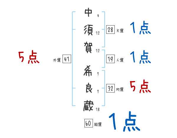 地運![]() | 中須賀希良蔵さんの地運は32画の5つ星!柔軟性があり成功する。チャンスが多く金運が良い。 個性を表す基礎的な運勢です。性格形成や対人関係、行動力など家庭環境に影響されます。主に誕生してから20歳くらいまでの若年期の運勢を表します。 |