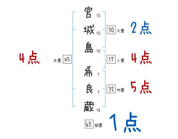 地運![]() | 宮城島希良蔵さんの地運は32画の5つ星!柔軟性があり成功する。チャンスが多く金運が良い。 個性を表す基礎的な運勢です。性格形成や対人関係、行動力など家庭環境に影響されます。主に誕生してから20歳くらいまでの若年期の運勢を表します。 |