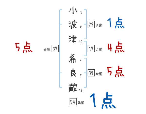 地運![]() | 小波津希良蔵さんの地運は32画の5つ星!柔軟性があり成功する。チャンスが多く金運が良い。 個性を表す基礎的な運勢です。性格形成や対人関係、行動力など家庭環境に影響されます。主に誕生してから20歳くらいまでの若年期の運勢を表します。 |