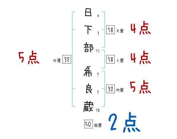 外運![]() | 日下部希良蔵さんの外運は32画の5つ星!柔軟性があり成功する。チャンスが多く金運が良い。 生活面を象徴する運勢です。外部から受ける影響力を表し、結婚運、家庭運や職場、環境への順応性を表します。 |