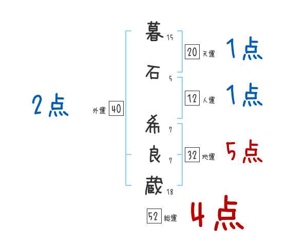 地運![]() | 暮石希良蔵さんの地運は32画の5つ星!柔軟性があり成功する。チャンスが多く金運が良い。 個性を表す基礎的な運勢です。性格形成や対人関係、行動力など家庭環境に影響されます。主に誕生してから20歳くらいまでの若年期の運勢を表します。 |