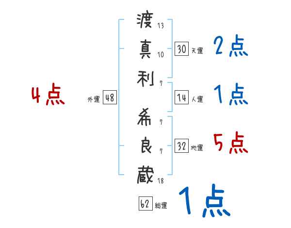 外運![]() | 渡真利希良蔵さんの外運は48画の4つ星!賢明な性格で人望が厚い。指導力があり多くの人に尊敬される。 生活面を象徴する運勢です。外部から受ける影響力を表し、結婚運、家庭運や職場、環境への順応性を表します。 |