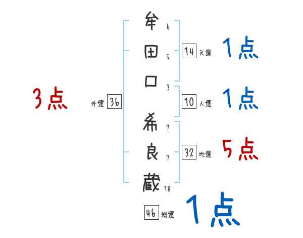 地運![]() | 牟田口希良蔵さんの地運は32画の5つ星!柔軟性があり成功する。チャンスが多く金運が良い。 個性を表す基礎的な運勢です。性格形成や対人関係、行動力など家庭環境に影響されます。主に誕生してから20歳くらいまでの若年期の運勢を表します。 |