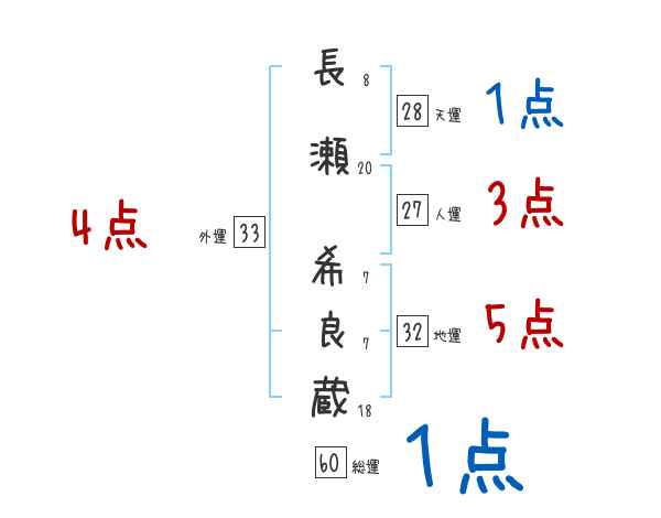 外運![]() | 長瀬希良蔵さんの外運は33画の4つ星!権力志向でプライドが高い。勇気があり運を切り開き成功する。 生活面を象徴する運勢です。外部から受ける影響力を表し、結婚運、家庭運や職場、環境への順応性を表します。 |