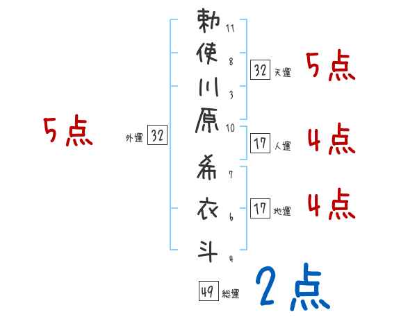 外運![]() | 勅使川原希衣斗さんの外運は32画の5つ星!柔軟性があり成功する。チャンスが多く金運が良い。 生活面を象徴する運勢です。外部から受ける影響力を表し、結婚運、家庭運や職場、環境への順応性を表します。 |