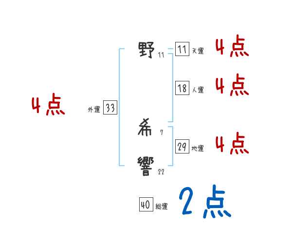 天運![]() | 野希響さんの天運は11画の4つ星!着実に富や地位を得る幸運な人生。 家系が持つ宿命的な運勢を表します。祖先から受け継いだ苗字ですので自分の力が及びません。家柄を象徴します。 |