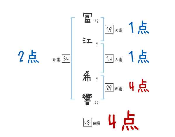 天運![]() | 冨江希響さんの天運は19画の1つ星!優れた才能を持ちますが、協調性が足りないことも。周りの人と協力する事を意識しましょう。 家系が持つ宿命的な運勢を表します。祖先から受け継いだ苗字ですので自分の力が及びません。家柄を象徴します。 |