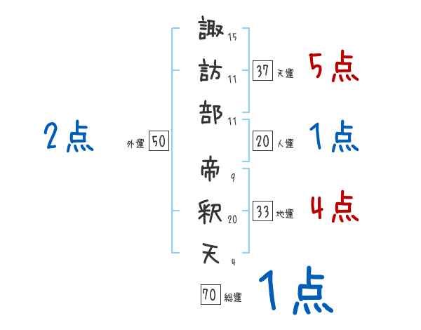 外運![]() | 諏訪部帝釈天さんの外運は50画の2つ星!浮き沈みが激しく不安定。しりすぼみに衰退しやすいので注意しましょう。 生活面を象徴する運勢です。外部から受ける影響力を表し、結婚運、家庭運や職場、環境への順応性を表します。 |