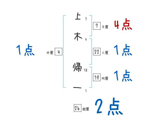 外運![]() | 上木帰一さんの外運は4画の1つ星!感情が不安定で苦労するかも。周囲との協調を心掛けましょう。 生活面を象徴する運勢です。外部から受ける影響力を表し、結婚運、家庭運や職場、環境への順応性を表します。 |