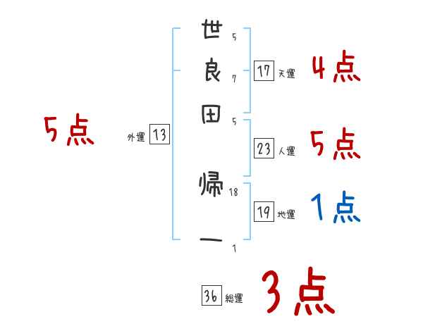 総運![]() | 世良田帰一さんの総運は36画の3つ星!先見性が豊かです。多少神経質で苦労することも。 あなたの人生を表す1番重要な運勢です。生涯を通じて影響する総合運となり、主に50歳以降の晩年期に影響を及ぼします。 |
