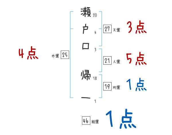 天運![]() | 瀬戸口帰一さんの天運は27画の3つ星!頭脳明晰だが強情で摩擦が多い傾向。孤立に注意。 家系が持つ宿命的な運勢を表します。祖先から受け継いだ苗字ですので自分の力が及びません。家柄を象徴します。 |
