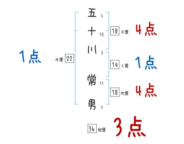 天運![]() | 五十川常男さんの天運は18画の4つ星!情熱的で剛気。忍耐力があり信頼される。 家系が持つ宿命的な運勢を表します。祖先から受け継いだ苗字ですので自分の力が及びません。家柄を象徴します。 |