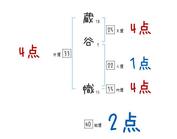 天運![]() | 蔵谷幟さんの天運は25画の4つ星!個性があり才能があふれる。強運の持ち主で発展する。 家系が持つ宿命的な運勢を表します。祖先から受け継いだ苗字ですので自分の力が及びません。家柄を象徴します。 |