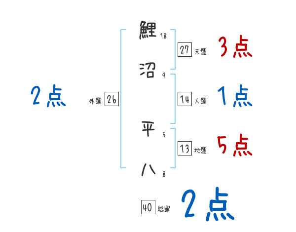 天運![]() | 鯉沼平八さんの天運は27画の3つ星!頭脳明晰だが強情で摩擦が多い傾向。孤立に注意。 家系が持つ宿命的な運勢を表します。祖先から受け継いだ苗字ですので自分の力が及びません。家柄を象徴します。 |