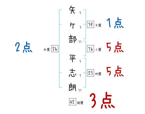 天運![]() | 矢ヶ部平志朗さんの天運は19画の1つ星!優れた才能を持ちますが、協調性が足りないことも。周りの人と協力する事を意識しましょう。 家系が持つ宿命的な運勢を表します。祖先から受け継いだ苗字ですので自分の力が及びません。家柄を象徴します。 |