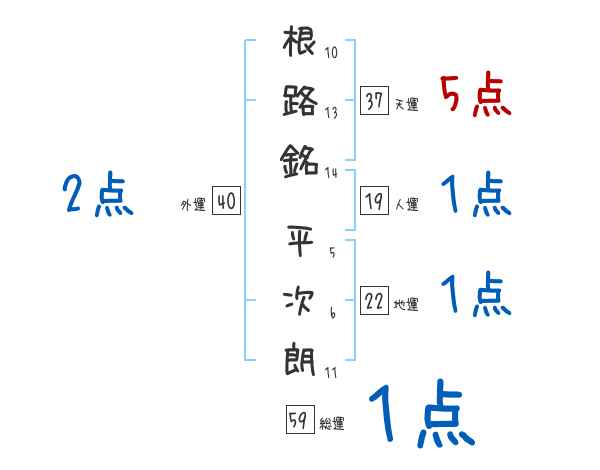 地運![]() | 根路銘平次朗さんの地運は22画の1つ星!努力することが苦手ないっぽう手先が器用。芸術性にも優れる。 個性を表す基礎的な運勢です。性格形成や対人関係、行動力など家庭環境に影響されます。主に誕生してから20歳くらいまでの若年期の運勢を表します。 |