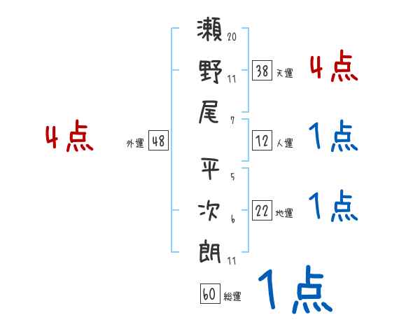 外運![]() | 瀬野尾平次朗さんの外運は48画の4つ星!賢明な性格で人望が厚い。指導力があり多くの人に尊敬される。 生活面を象徴する運勢です。外部から受ける影響力を表し、結婚運、家庭運や職場、環境への順応性を表します。 |
