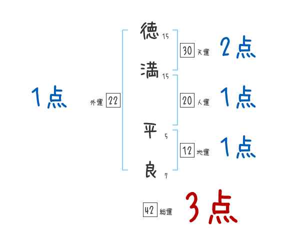 総運![]() | 徳満平良さんの総運は42画の3つ星!病気に注意。多芸であるが消極的でおとなしい。 あなたの人生を表す1番重要な運勢です。生涯を通じて影響する総合運となり、主に50歳以降の晩年期に影響を及ぼします。 |