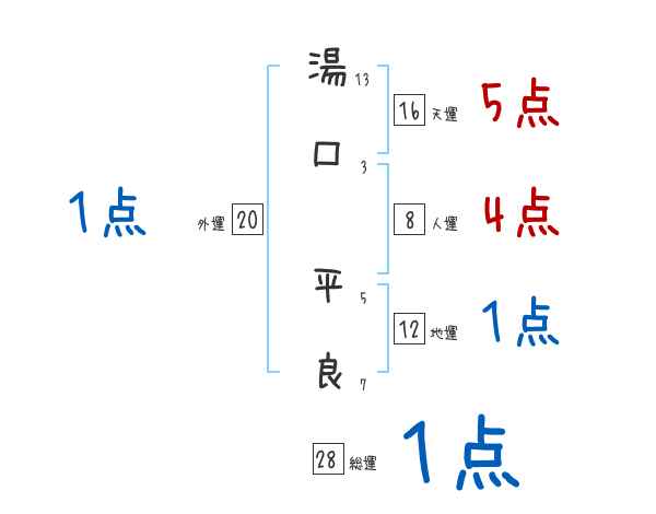 総運![]() | 湯口平良さんの総運は28画の1つ星!家庭環境に注意。スポーツで活躍できる能力があるかも。 あなたの人生を表す1番重要な運勢です。生涯を通じて影響する総合運となり、主に50歳以降の晩年期に影響を及ぼします。 |