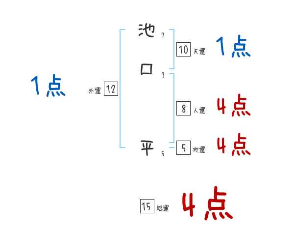 天運![]() | 池口平さんの天運は10画の1つ星!不安を感じやすい傾向。ストレスを抱えないように注意しましょう。 家系が持つ宿命的な運勢を表します。祖先から受け継いだ苗字ですので自分の力が及びません。家柄を象徴します。 |