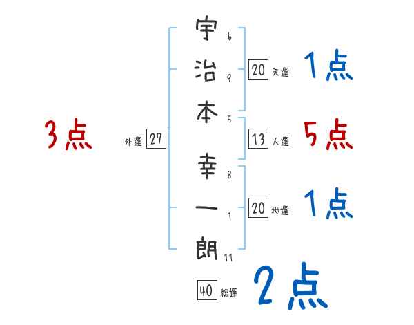外運![]() | 宇治本幸一朗さんの外運は27画の3つ星!頭脳明晰だが強情で摩擦が多い傾向。孤立に注意。 生活面を象徴する運勢です。外部から受ける影響力を表し、結婚運、家庭運や職場、環境への順応性を表します。 |