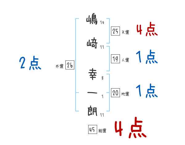 天運![]() | 嶋﨑幸一朗さんの天運は25画の4つ星!個性があり才能があふれる。強運の持ち主で発展する。 家系が持つ宿命的な運勢を表します。祖先から受け継いだ苗字ですので自分の力が及びません。家柄を象徴します。 |