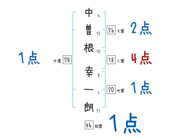 天運![]() | 中曽根幸一朗さんの天運は26画の2つ星!波瀾万丈かも。信頼できる人を大事にしましょう。 家系が持つ宿命的な運勢を表します。祖先から受け継いだ苗字ですので自分の力が及びません。家柄を象徴します。 |