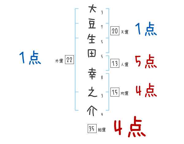 総運![]() | 大豆生田幸之介さんの総運は35画の4つ星!温厚な性格で感受性が高い。穏和な性格で人望が厚い。 あなたの人生を表す1番重要な運勢です。生涯を通じて影響する総合運となり、主に50歳以降の晩年期に影響を及ぼします。 |