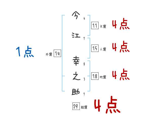 外運![]() | 今江幸之助さんの外運は14画の1つ星!人に対して優しいがストレスを溜め込みがち。人間関係のトラブルを避けるよう気をつけましょう。 生活面を象徴する運勢です。外部から受ける影響力を表し、結婚運、家庭運や職場、環境への順応性を表します。 |