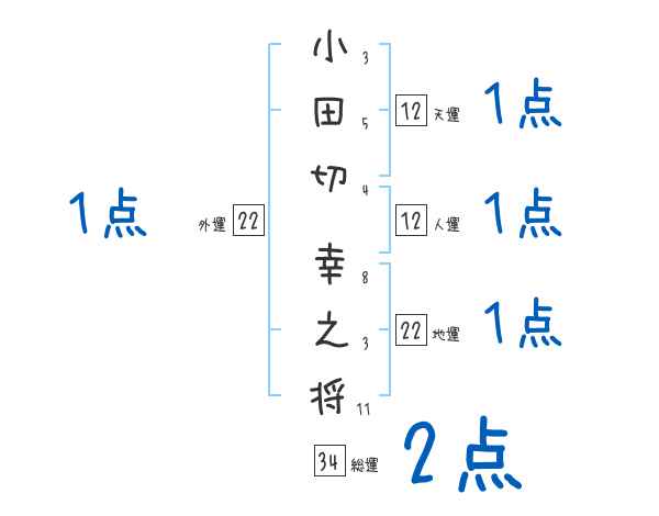 天運![]() | 小田切幸之将さんの天運は12画の1つ星!簡単な失敗で諦めてしまいやすいかも。着実に行動すると良いでしょう。 家系が持つ宿命的な運勢を表します。祖先から受け継いだ苗字ですので自分の力が及びません。家柄を象徴します。 |