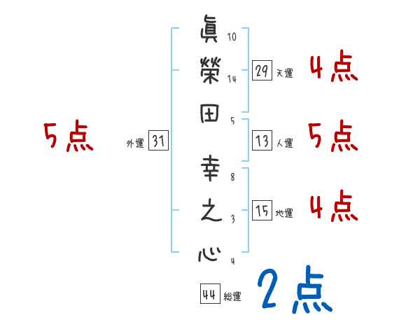 総運![]() | 眞榮田幸之心さんの総運は44画の2つ星!誠実で慎重な性格。物事を考えすぎないように注意しましょう。 あなたの人生を表す1番重要な運勢です。生涯を通じて影響する総合運となり、主に50歳以降の晩年期に影響を及ぼします。 |