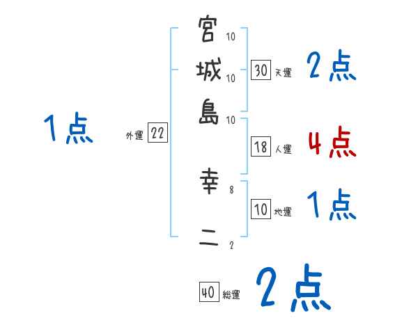 天運![]() | 宮城島幸二さんの天運は30画の2つ星!浮き沈みの激しさに注意しましょう。 家系が持つ宿命的な運勢を表します。祖先から受け継いだ苗字ですので自分の力が及びません。家柄を象徴します。 |