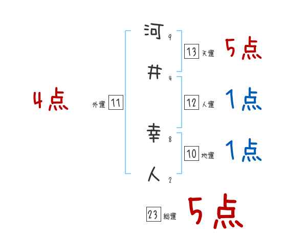 天運![]() | 河井幸人さんの天運は13画の5つ星!才能に恵まれ人気がある。名声を手に入れる。円満な人生。 家系が持つ宿命的な運勢を表します。祖先から受け継いだ苗字ですので自分の力が及びません。家柄を象徴します。 |