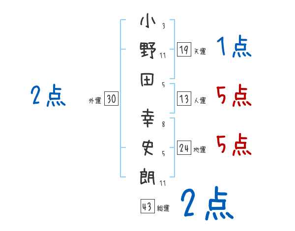 総運![]() | 小野田幸史朗さんの総運は43画の2つ星!頑固な性格で独立心が強いかも。やや非現実的で浪費に注意しましょう。 あなたの人生を表す1番重要な運勢です。生涯を通じて影響する総合運となり、主に50歳以降の晩年期に影響を及ぼします。 |