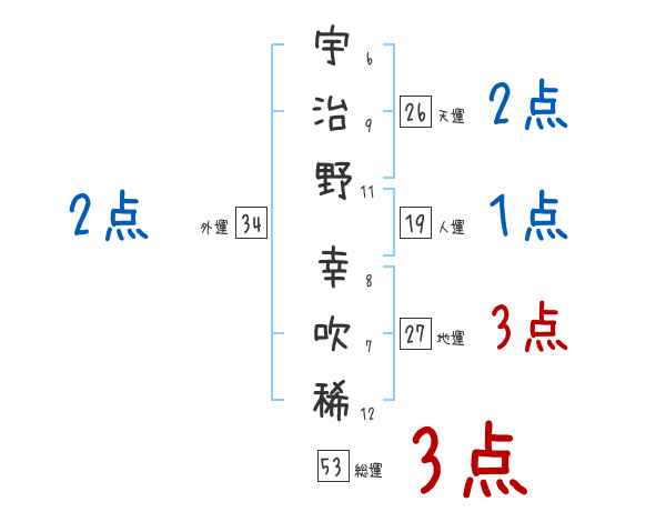 天運![]() | 宇治野幸吹稀さんの天運は26画の2つ星!波瀾万丈かも。信頼できる人を大事にしましょう。 家系が持つ宿命的な運勢を表します。祖先から受け継いだ苗字ですので自分の力が及びません。家柄を象徴します。 |