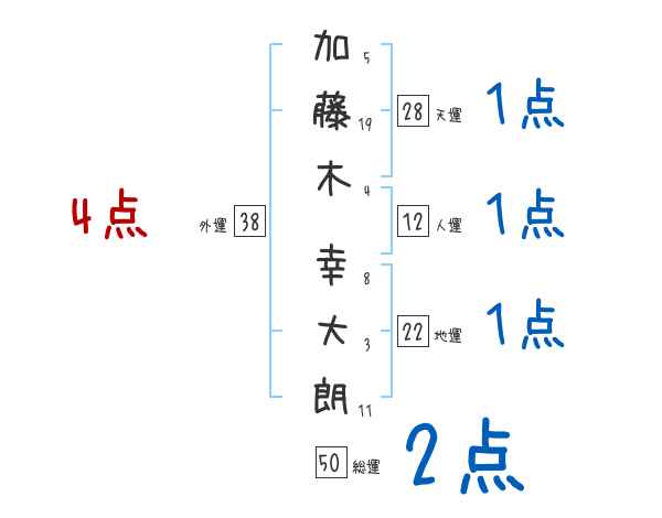 天運![]() | 加藤木幸大朗さんの天運は28画の1つ星!家庭環境に注意。スポーツで活躍できる能力があるかも。 家系が持つ宿命的な運勢を表します。祖先から受け継いだ苗字ですので自分の力が及びません。家柄を象徴します。 |