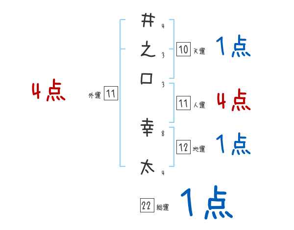 総運![]() | 井之口幸太さんの総運は22画の1つ星!努力することが苦手ないっぽう手先が器用。芸術性にも優れる。 あなたの人生を表す1番重要な運勢です。生涯を通じて影響する総合運となり、主に50歳以降の晩年期に影響を及ぼします。 |