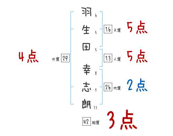 外運![]() | 羽生田幸志朗さんの外運は29画の4つ星!完全主義で才能がある。厳格な心の持ち主。 生活面を象徴する運勢です。外部から受ける影響力を表し、結婚運、家庭運や職場、環境への順応性を表します。 |