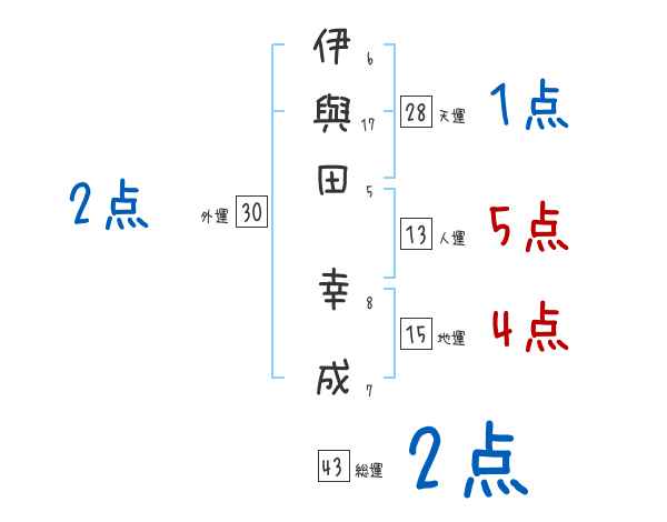 総運![]() | 伊與田幸成さんの総運は43画の2つ星!頑固な性格で独立心が強いかも。やや非現実的で浪費に注意しましょう。 あなたの人生を表す1番重要な運勢です。生涯を通じて影響する総合運となり、主に50歳以降の晩年期に影響を及ぼします。 |