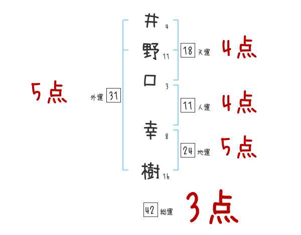 天運![]() | 井野口幸樹さんの天運は18画の4つ星!情熱的で剛気。忍耐力があり信頼される。 家系が持つ宿命的な運勢を表します。祖先から受け継いだ苗字ですので自分の力が及びません。家柄を象徴します。 |