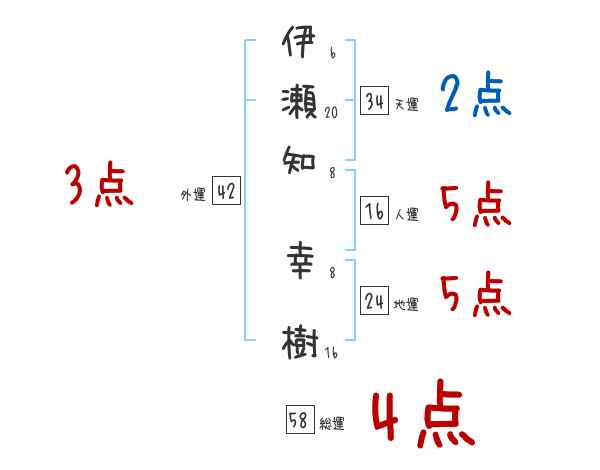 外運![]() | 伊瀬知幸樹さんの外運は42画の3つ星!病気に注意。多芸であるが消極的でおとなしい。 生活面を象徴する運勢です。外部から受ける影響力を表し、結婚運、家庭運や職場、環境への順応性を表します。 |