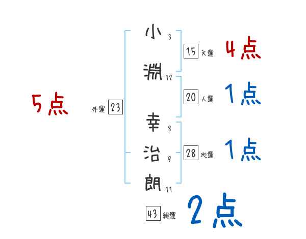 外運![]() | 小淵幸治朗さんの外運は23画の5つ星!想像力に優れ活力がある。一代で成功し名誉を手に入れる。 生活面を象徴する運勢です。外部から受ける影響力を表し、結婚運、家庭運や職場、環境への順応性を表します。 |
