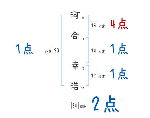 総運![]() | 河合幸浩さんの総運は34画の2つ星!独創性に優れるが、自尊心が強く災難に注意しましょう。 あなたの人生を表す1番重要な運勢です。生涯を通じて影響する総合運となり、主に50歳以降の晩年期に影響を及ぼします。 |