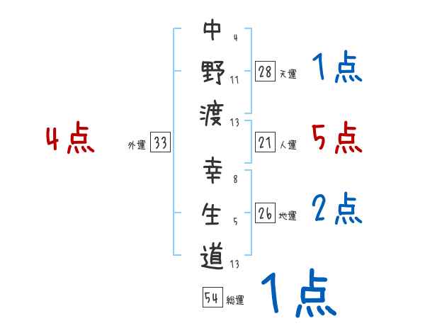 天運![]() | 中野渡幸生道さんの天運は28画の1つ星!家庭環境に注意。スポーツで活躍できる能力があるかも。 家系が持つ宿命的な運勢を表します。祖先から受け継いだ苗字ですので自分の力が及びません。家柄を象徴します。 |