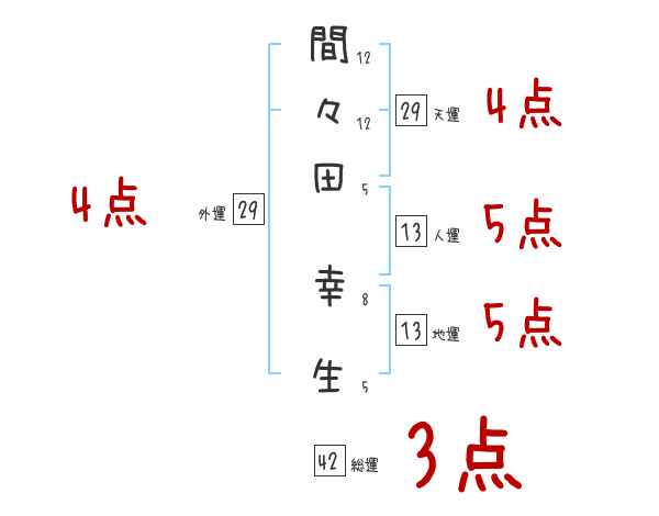 外運![]() | 間々田幸生さんの外運は29画の4つ星!完全主義で才能がある。厳格な心の持ち主。 生活面を象徴する運勢です。外部から受ける影響力を表し、結婚運、家庭運や職場、環境への順応性を表します。 |
