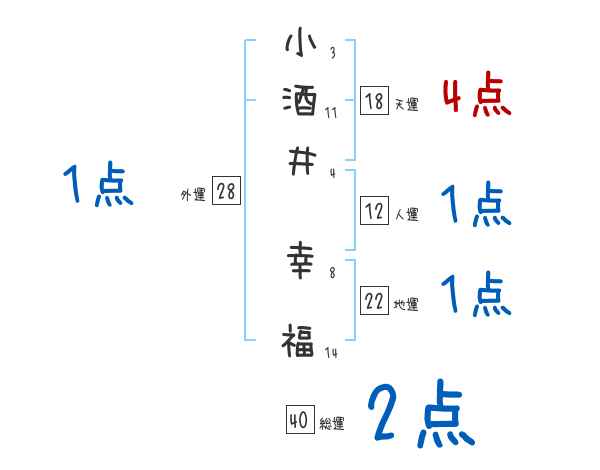 天運![]() | 小酒井幸福さんの天運は18画の4つ星!情熱的で剛気。忍耐力があり信頼される。 家系が持つ宿命的な運勢を表します。祖先から受け継いだ苗字ですので自分の力が及びません。家柄を象徴します。 |