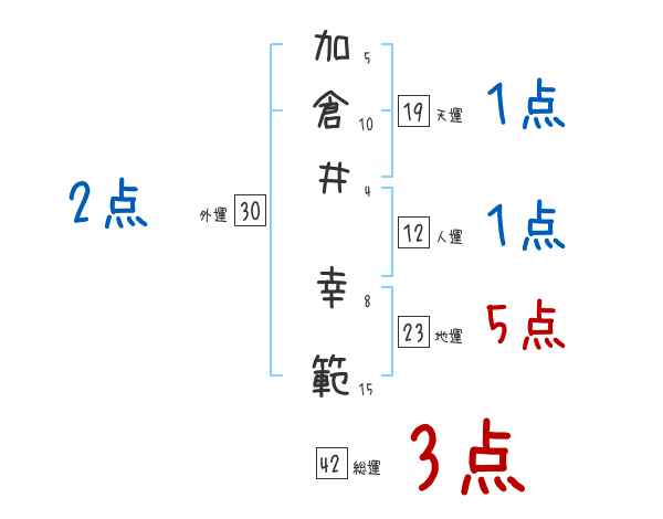 総運![]() | 加倉井幸範さんの総運は42画の3つ星!病気に注意。多芸であるが消極的でおとなしい。 あなたの人生を表す1番重要な運勢です。生涯を通じて影響する総合運となり、主に50歳以降の晩年期に影響を及ぼします。 |
