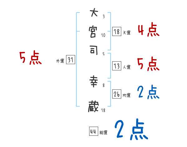 天運![]() | 大宮司幸蔵さんの天運は18画の4つ星!情熱的で剛気。忍耐力があり信頼される。 家系が持つ宿命的な運勢を表します。祖先から受け継いだ苗字ですので自分の力が及びません。家柄を象徴します。 |