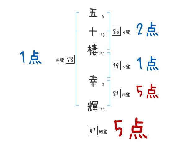 総運![]() | 五十棲幸輝さんの総運は47画の5つ星!実力が開花し発展する円満な人生。財に恵まれる。 あなたの人生を表す1番重要な運勢です。生涯を通じて影響する総合運となり、主に50歳以降の晩年期に影響を及ぼします。 |
